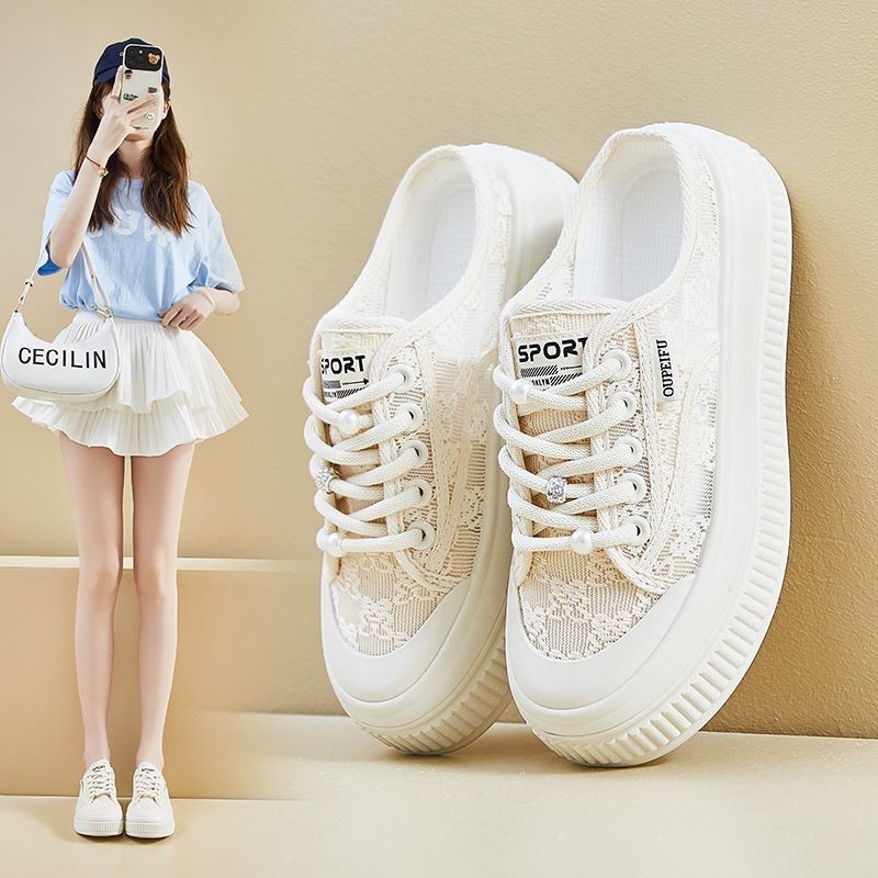 ins潮韓版半拖小白鞋女 夏季新款休閒厚底鞋 正常鞋碼,底厚4cm