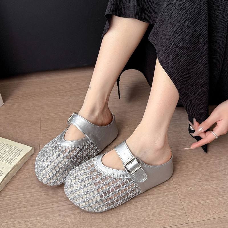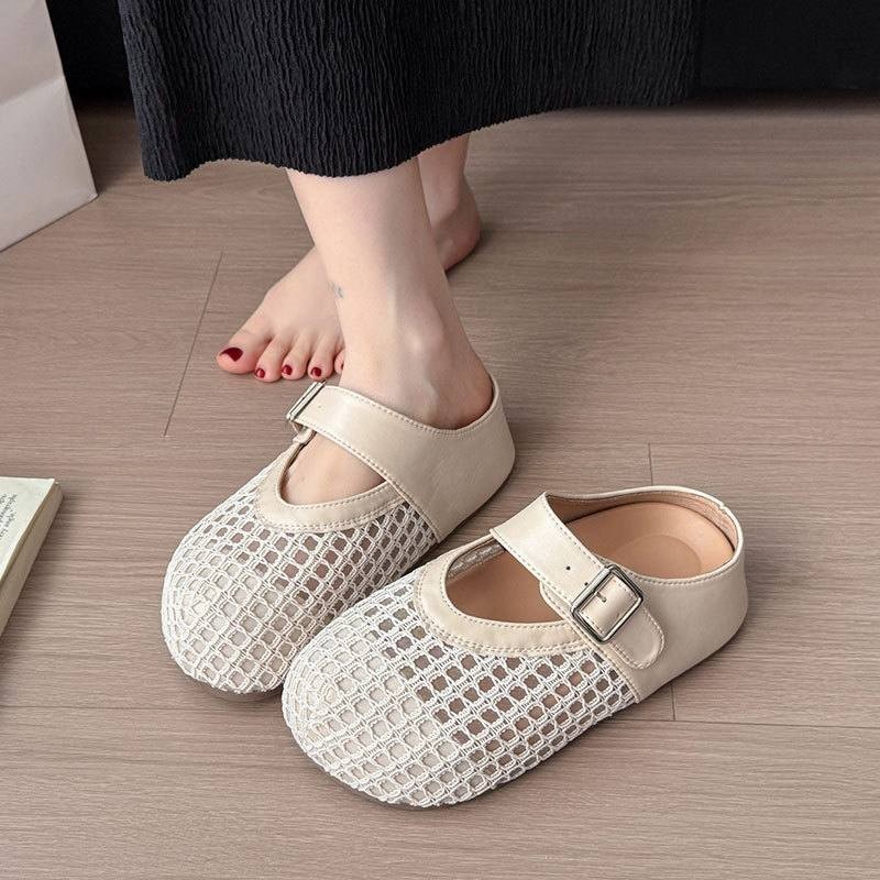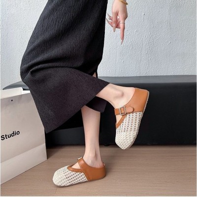 法式網紅鏤空編織包頭半拖鞋女 新款夏季透氣厚底外穿涼拖鞋,底厚5cm