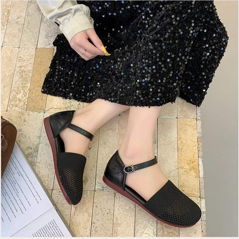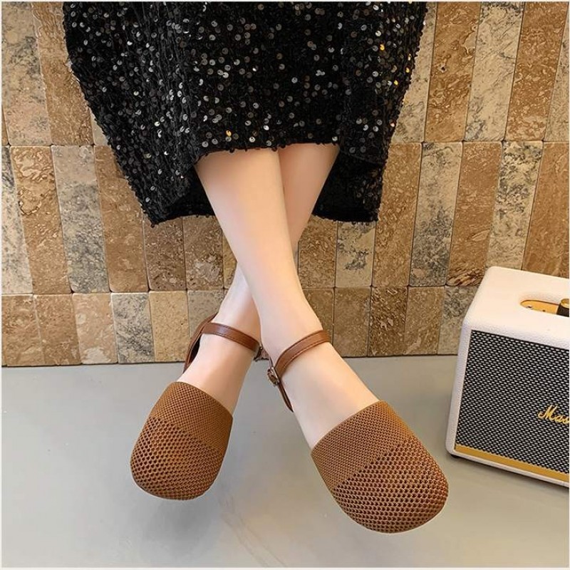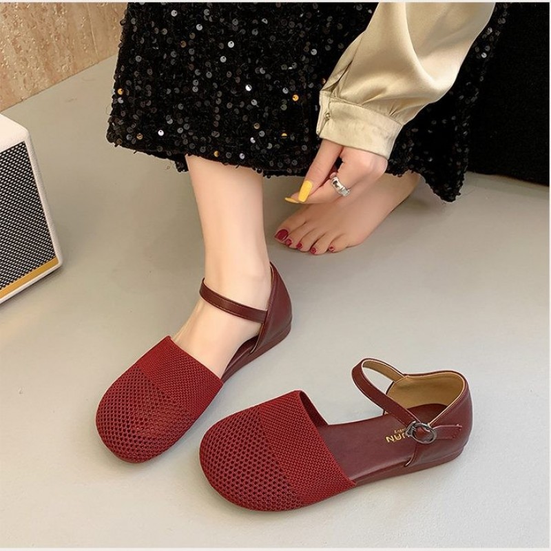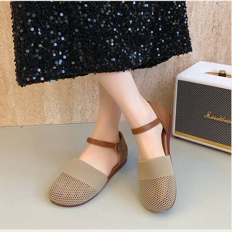 復古針織一字扣帶女鞋 軟底簡約舒適包頭羅馬鞋