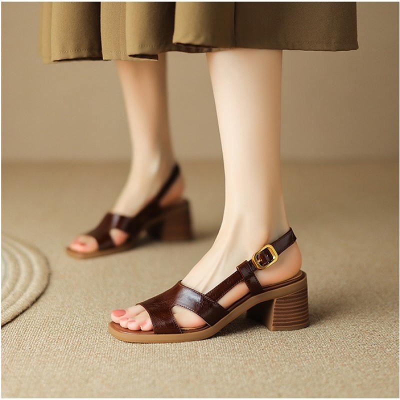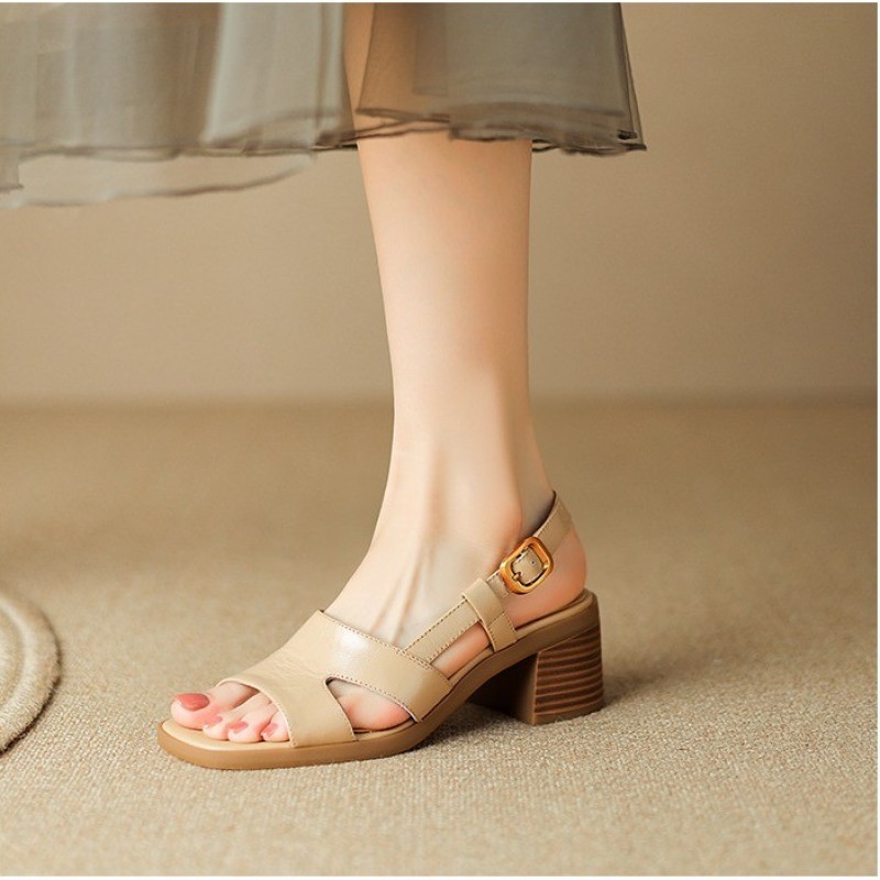 極簡風~方頭露趾涼鞋女 夏新款休閒通勤粗高跟鞋