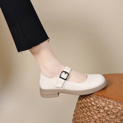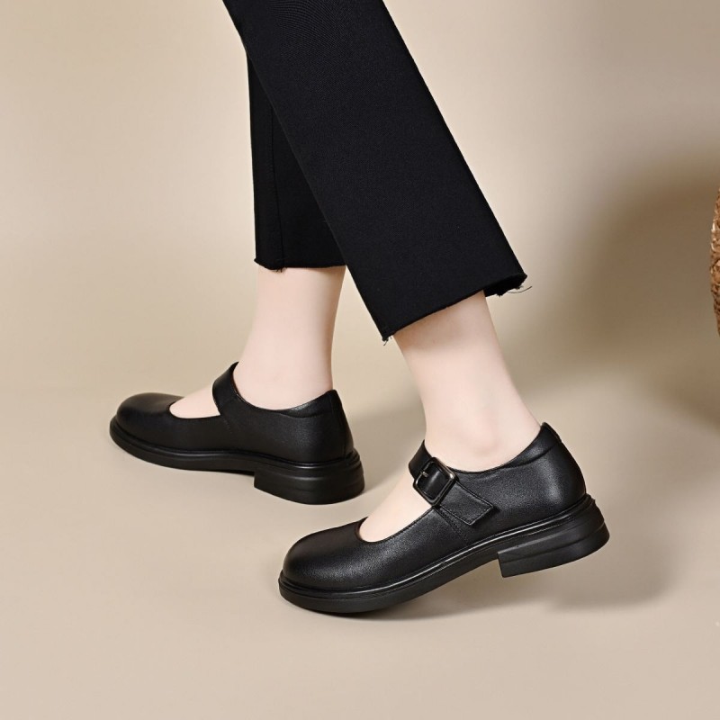 【真皮系列】圓頭瑪莉珍鞋女 頭層牛皮一字扣淺口平底皮鞋